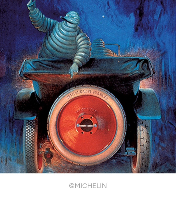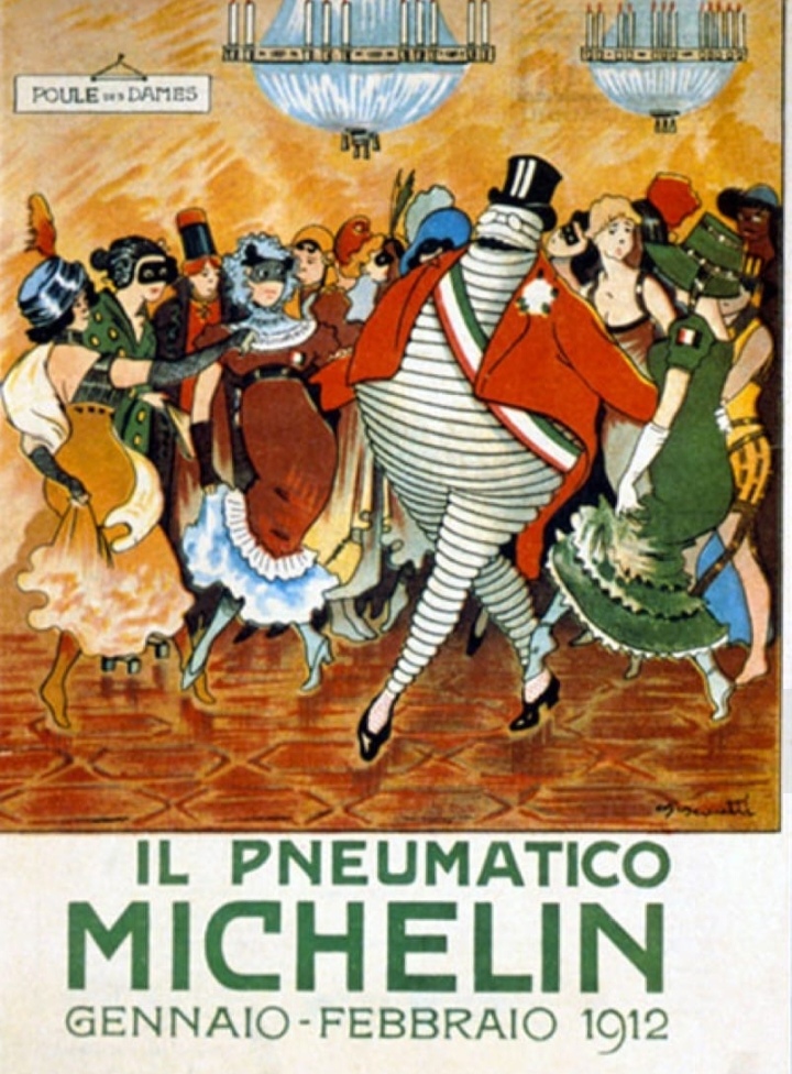 Cuando en 1907 MICHELIN lanzó una revista de viajes en Italia, Bibendum recibió el encargo de escribir una columna fija en la que pudiera expresar sus opiniones. En una reseña sobre un Baile de las Naciones al que había asistido, Bibendum elogió a las damas representantes de diversas culturas, mostrando su especial admiración por las italianas: “Oh, sublime Madonna, destino de Roma, acepta mi homenaje, tú, cuyos ojos brillan con el esplendor del Renacimiento.”