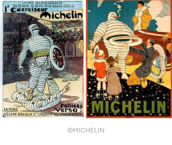 En los primeros días de su vida, Bibendum llegó a ser representado como gladiador, boxeador, ágil bailarín de salón (en Italia) y hasta como un sibarita mujeriego aficionado a los puros y la cerveza, guiño este último destinado a las clases pudientes, las únicas que por aquel entonces podían permitirse el lujo de comprar un coche.